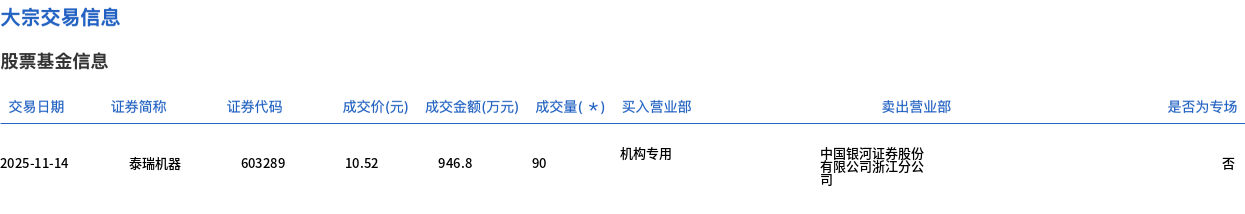 j9.com11月14日,泰瑞机器大宗交易成交90万股,成交额946.8万元,占当日总成交额的5.58%,成交价10.52元,较市场收盘价10.68元折价1.5%。